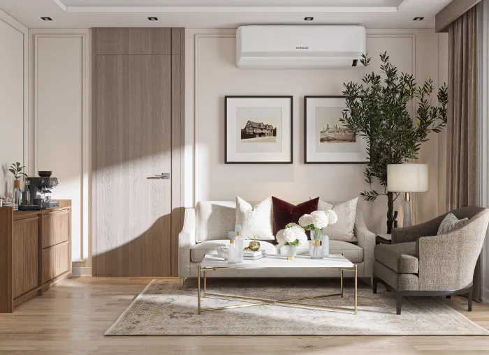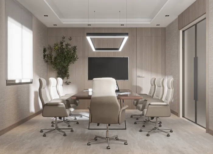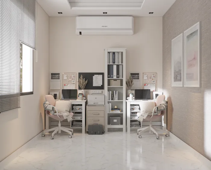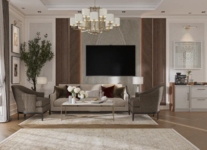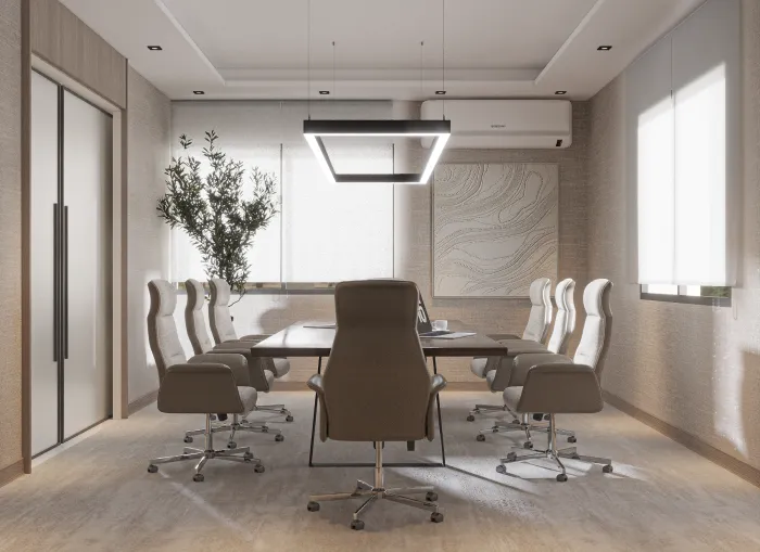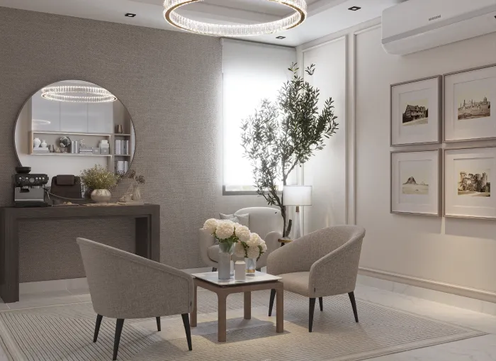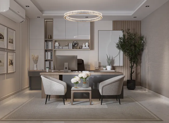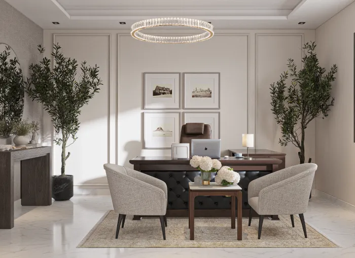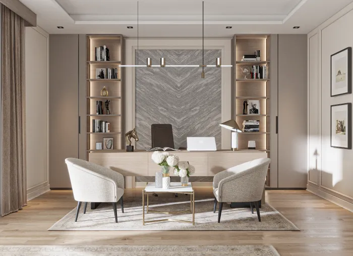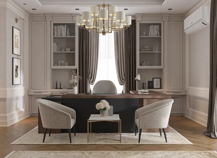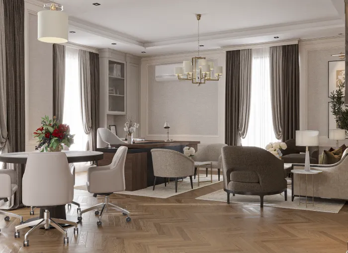 The office was designed in a neoclassical style with a modern twist, emphasizing simplicity in design and achieving a functional structure in a smart and efficient way. The result is a harmonious blend of classic elegance and contemporary sophistication, creating a productive and inspiring workspace.