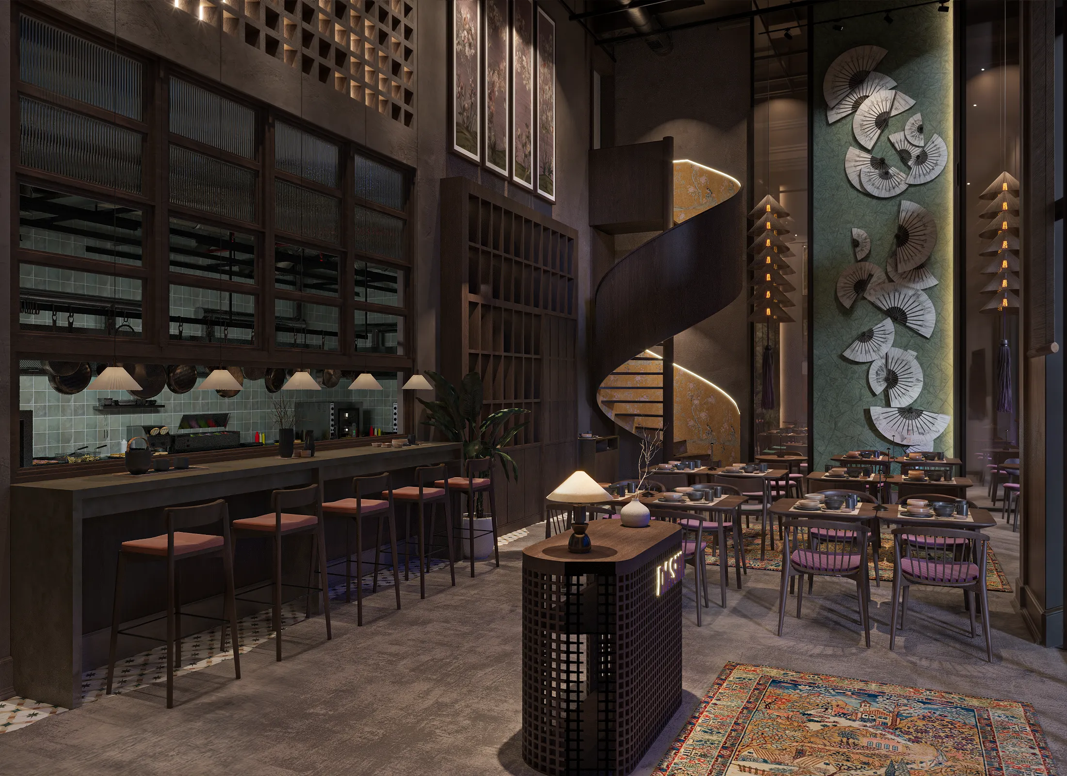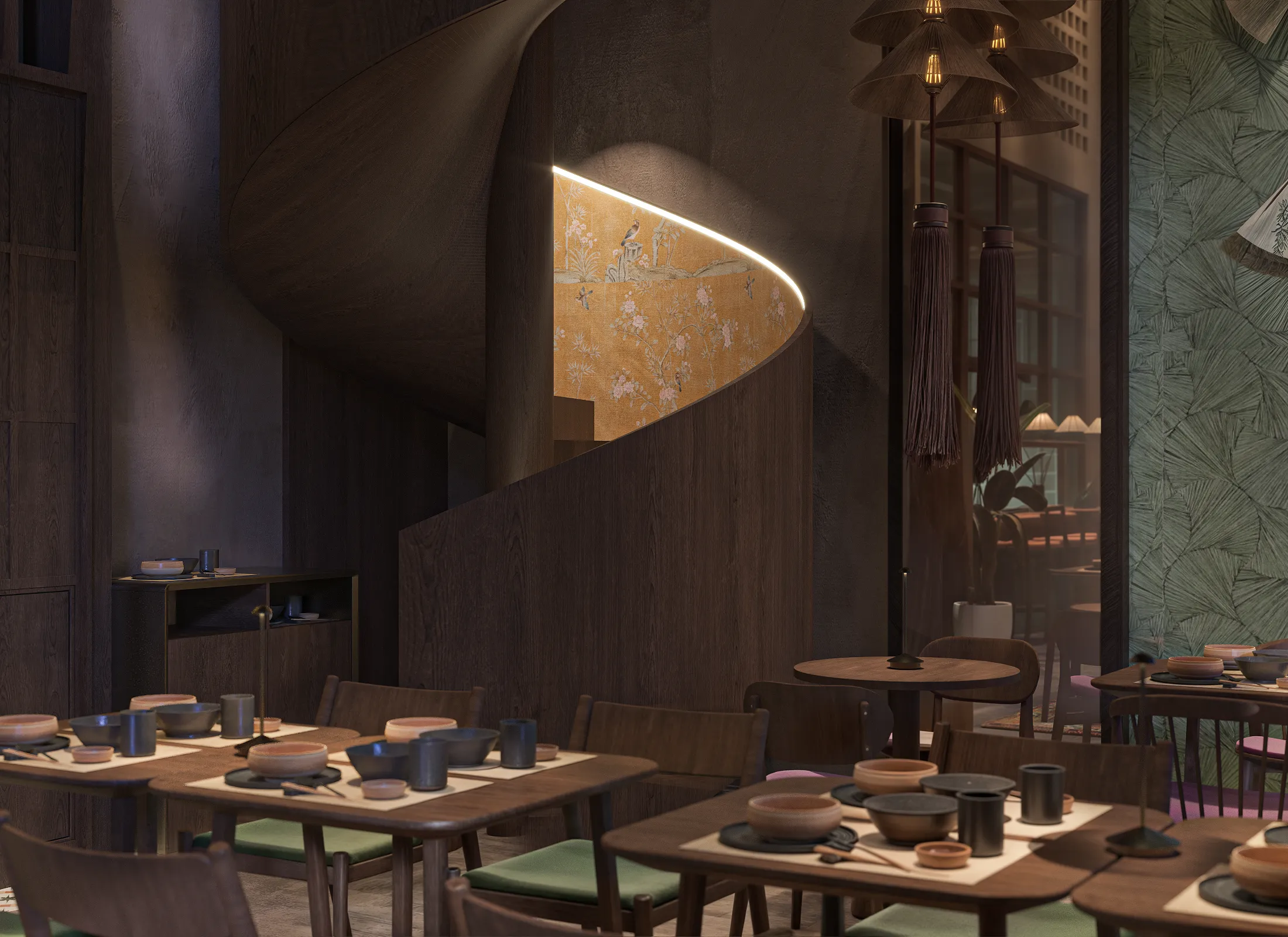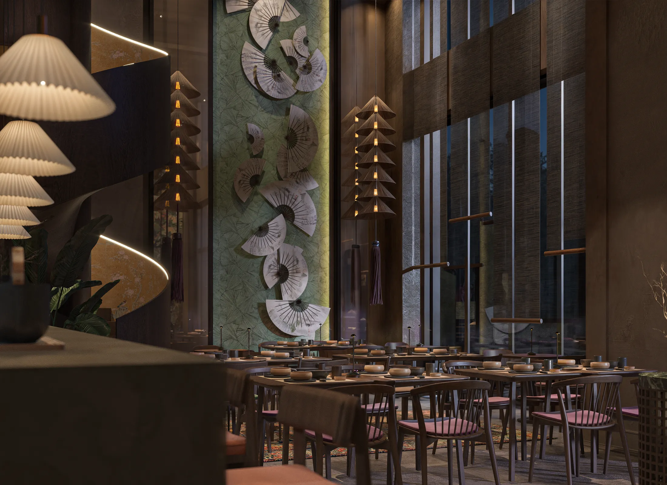 A restaurant serving Asian cuisine, designed to reflect the diverse cultures of East Asia. Wood was used in the design to create a warm and intimate atmosphere, while walls and ceilings were adorned with ornaments that express the rich heritage and culture of this region.