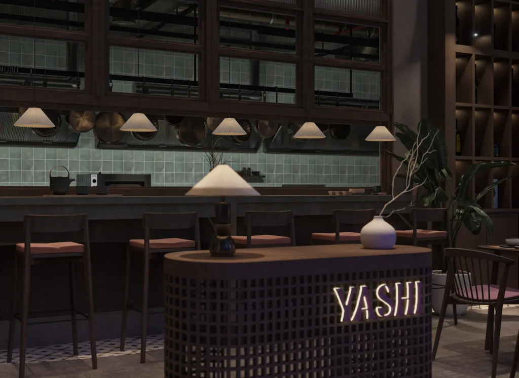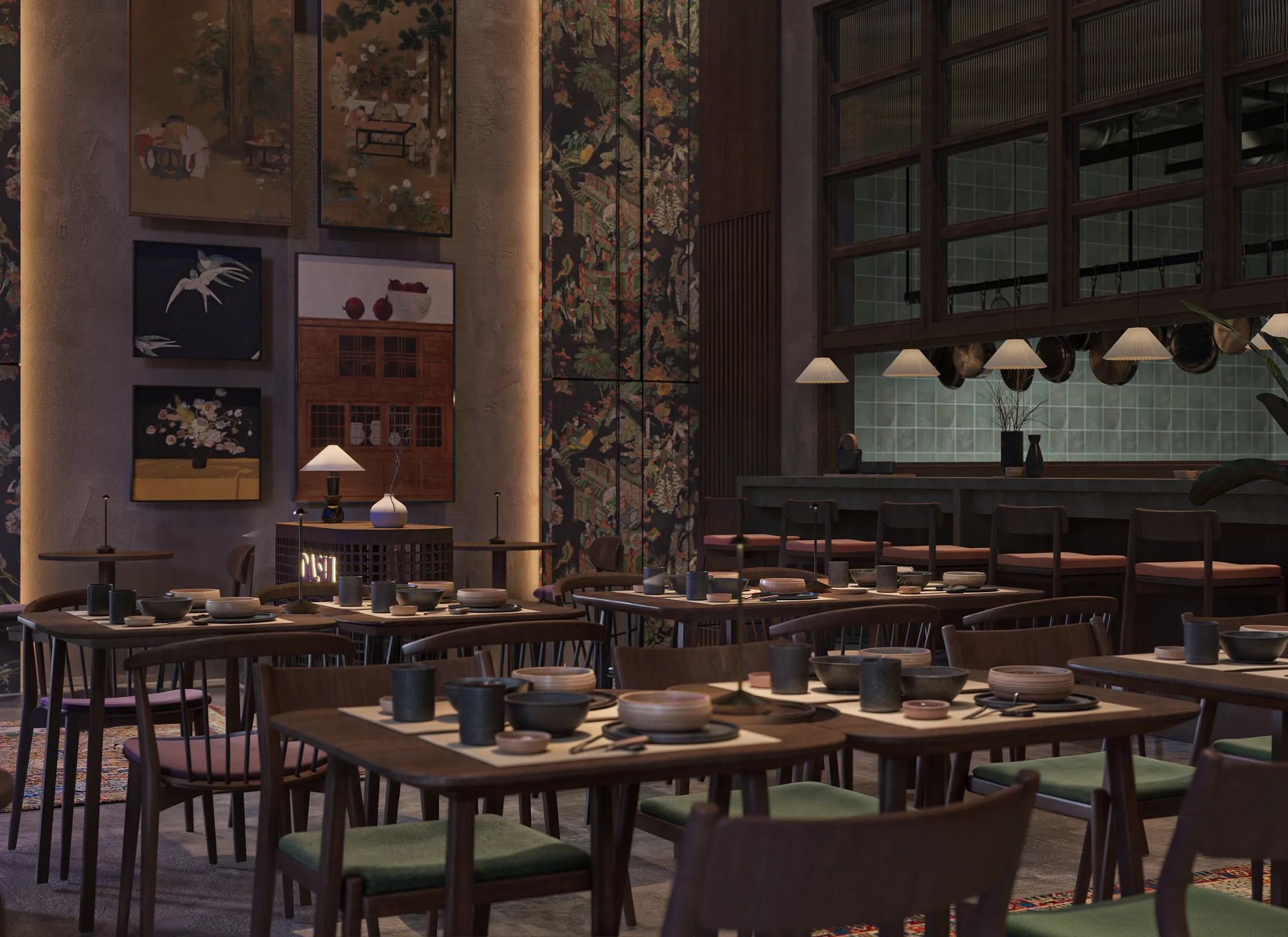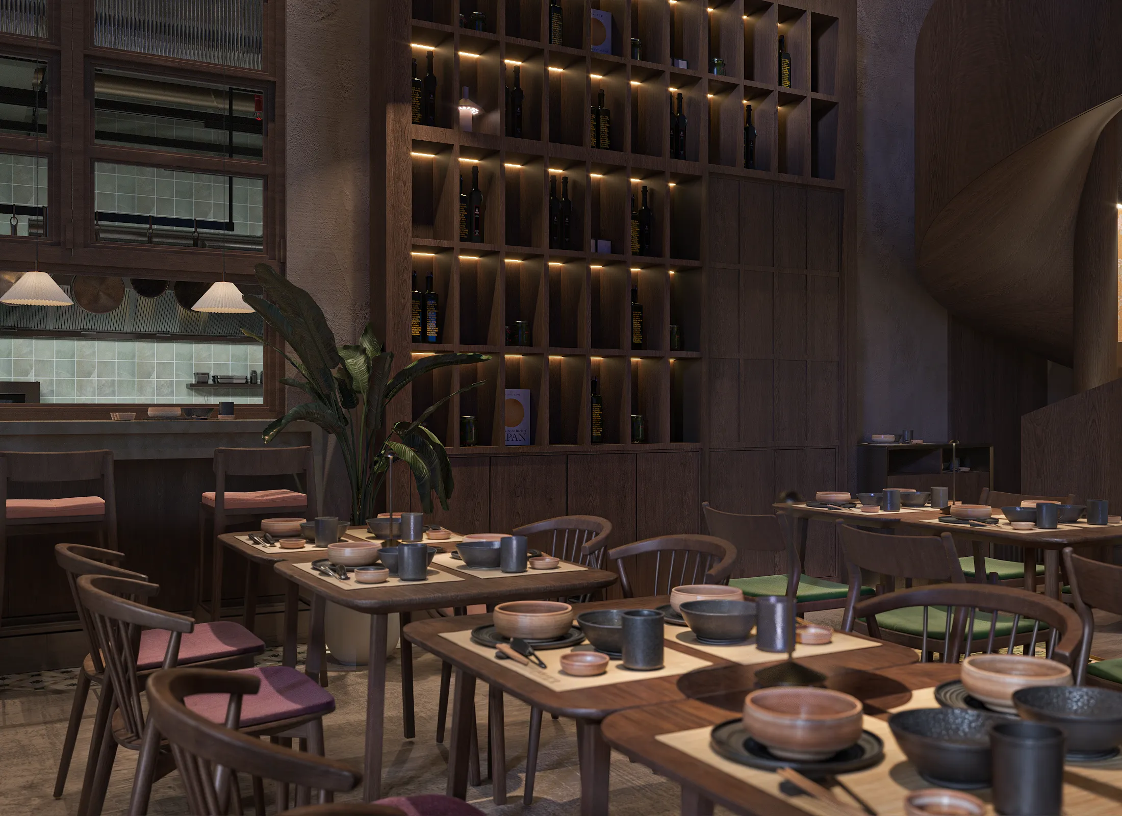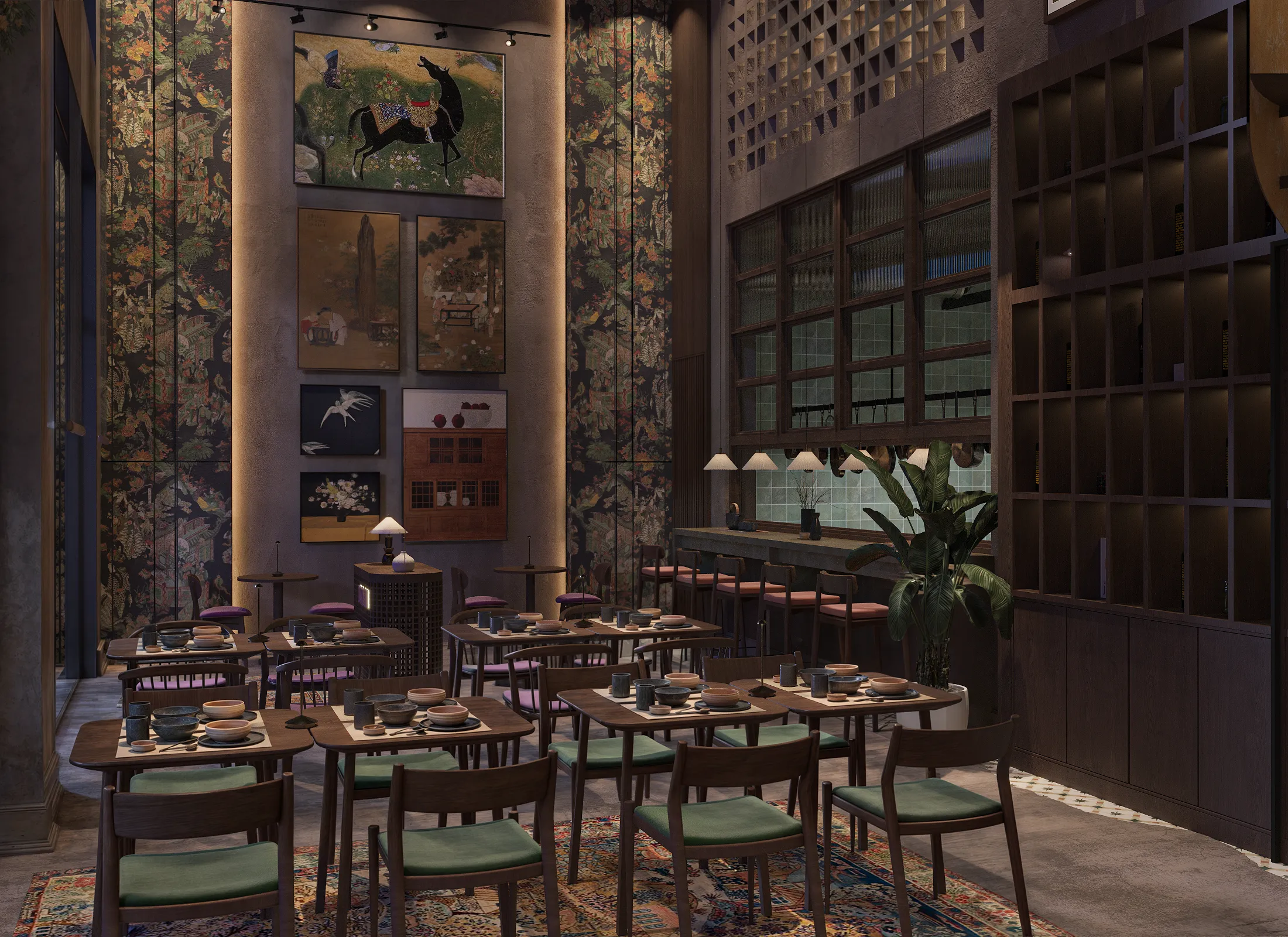 A restaurant serving Asian cuisine, designed to reflect the diverse cultures of East Asia. Wood was used in the design to create a warm and intimate atmosphere, while walls and ceilings were adorned with ornaments that express the rich heritage and culture of this region.